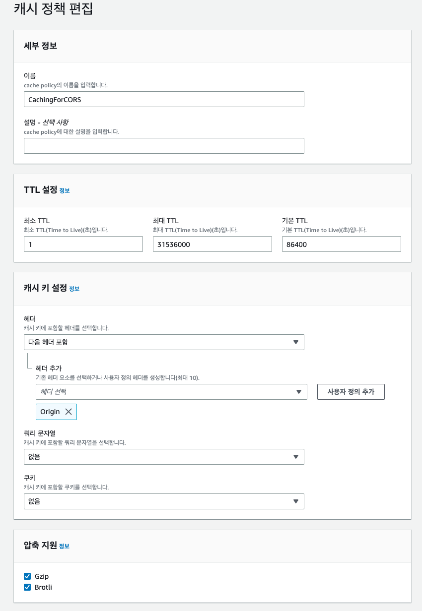 이름은 편한걸로 설정하면되구, 헤더에 Origin을 추가하고 완료 버튼 눌러서 캐시 키 및 원본요청페이지 > 캐시 정책 오른쪽 새로고침 후 새로 만든 정책으로 설정해주면 CDN은 설정끗!