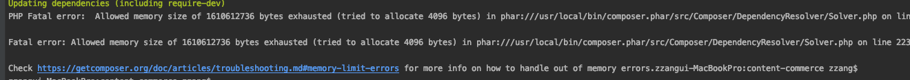 PHP Fetal error: Allowed memory size of 1610612736 bytes exhausted (tried to allocate 4096 bytes) in phar:///usr/local/bin/composer.phar/src/Composer/DependencyResolver/Solver.php on 233