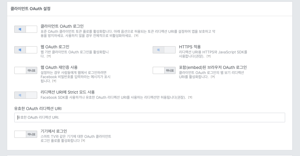 위 사진과 같이 맞춰준 다음 유효한 OAuth 리다이렉션 URI를 맞게 입력해준다고 하는데 나는 해보지 않아서 잘 모른다ㅠㅠㅠ
