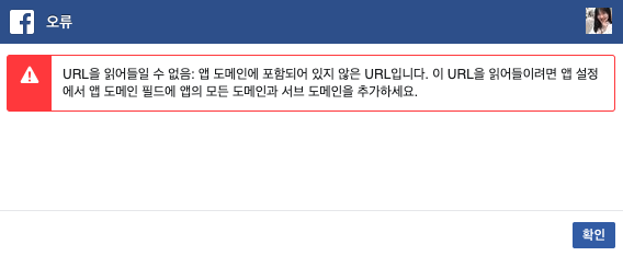 2. URL을 읽어들일 수 없음: 앱 도메인에 포함되어 있지 않은 URL입니다. 이 URL을 읽어들이려면 앱 설정에서 앱 도메인 필드에 앱의 모든 도메인과 서브 도메인을 추가하세요.